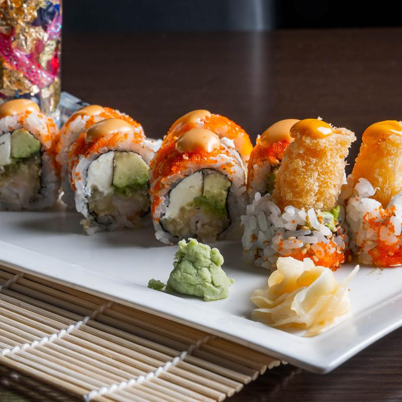 Shrimp tempura, spicy yellowtail, tuna, salmon, avocado, wrapped with soy paper, and colorful tobiko on top.