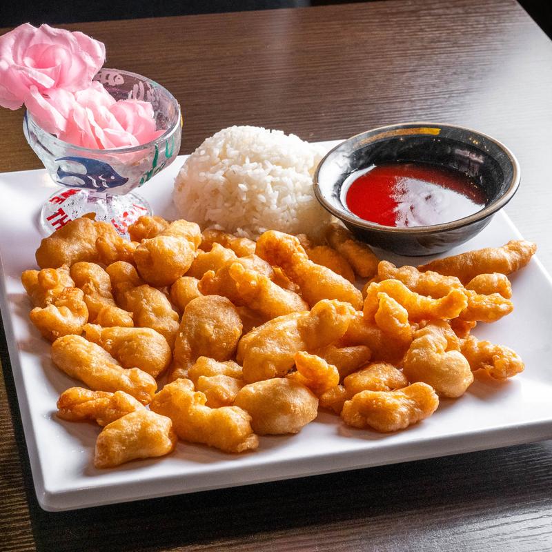 One side shrimp with chili sauce, and the other side General Tso’s chicken.