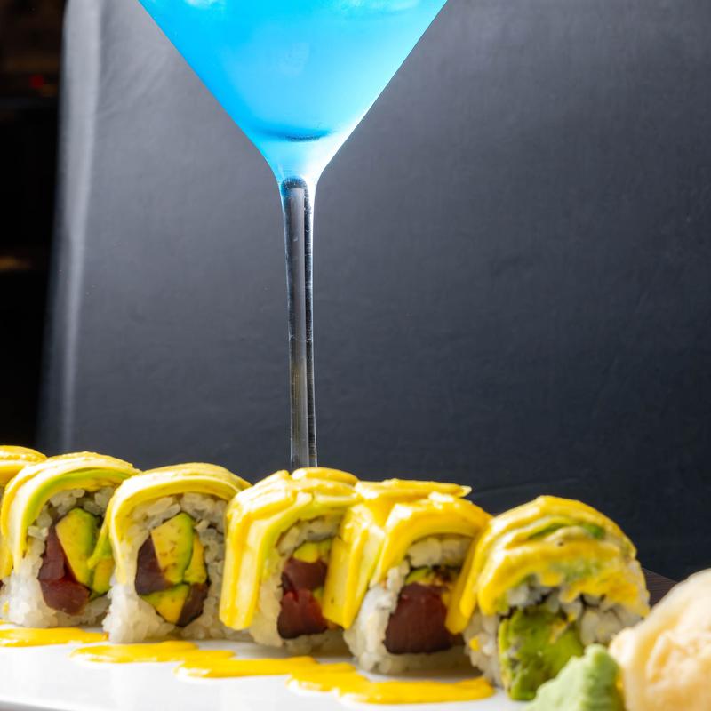 Tuna, salmon, yellowtail inside topped with avocado, black pepper tuna with wasabi sauce.