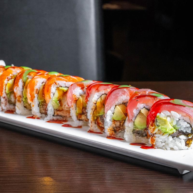 Tuna, smoked salmon, avocado inside, top with fresh salmon with tobiko wasabi sauce.