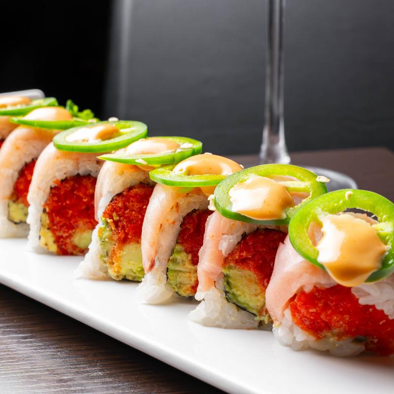Shrimp tempura, cucumber inside, avocado on top with eel sauce, sweet chili sauce, spicy mayo.