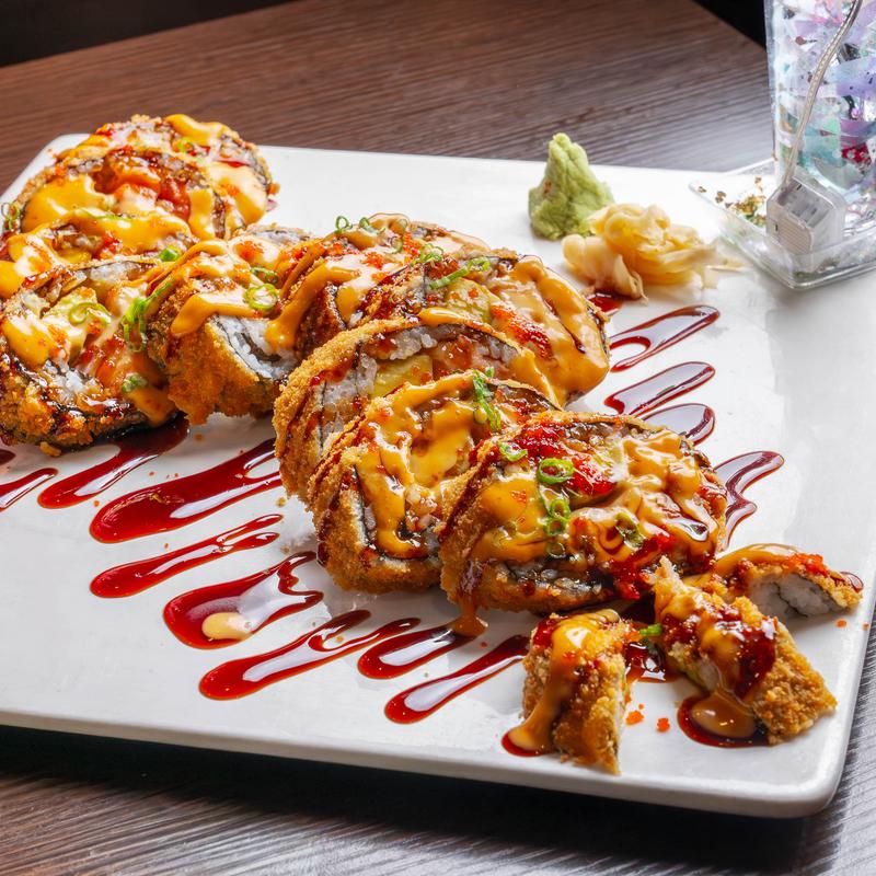 Deep-fried smoked salmon, cream cheese & avocado with spicy mayo & eel sauce on top.