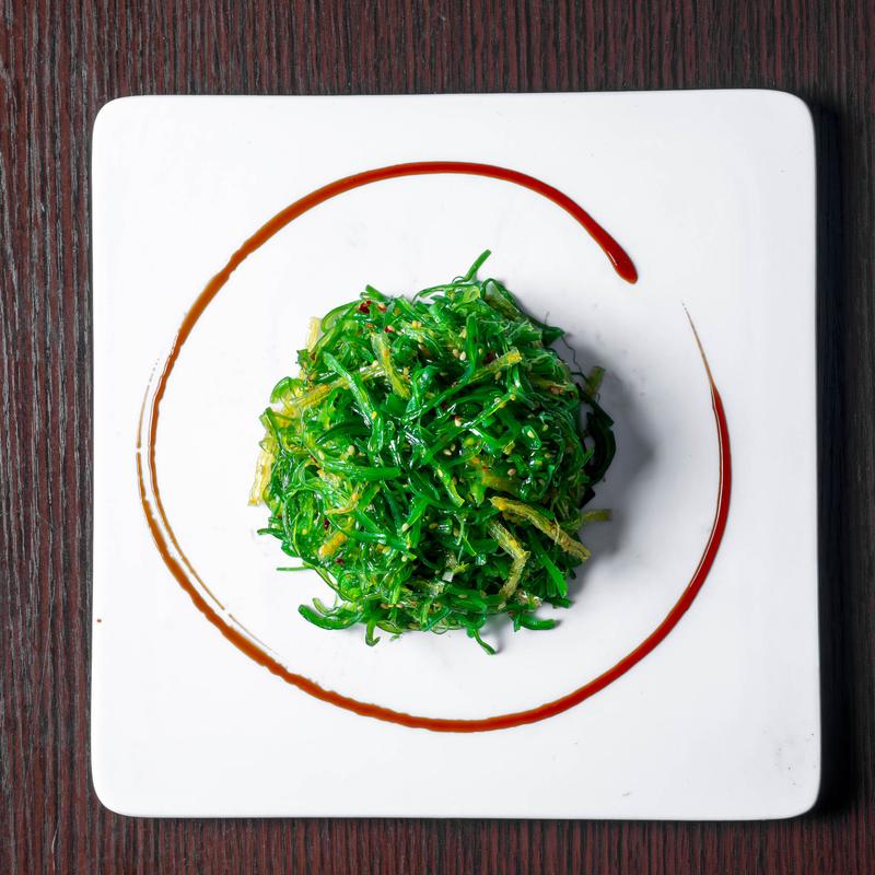 Toasted crispy salmon skin on cucumber & seaweed salad with special sauce.