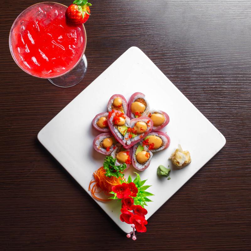 Spicy crunchy salmon, spicy crunchy yellowtail, avocado top with tuna heart shapes.